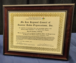 Award and Certificate is presented to W0VK - Bret M. Kuhns